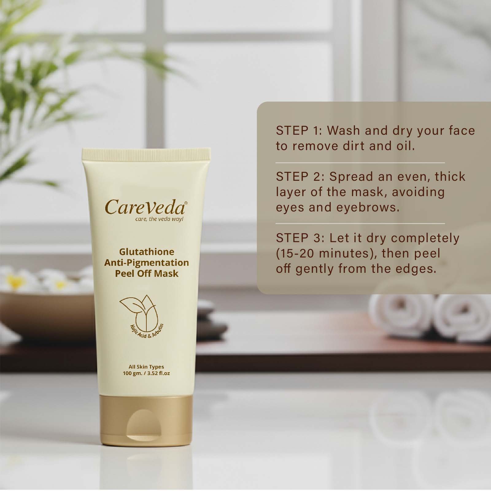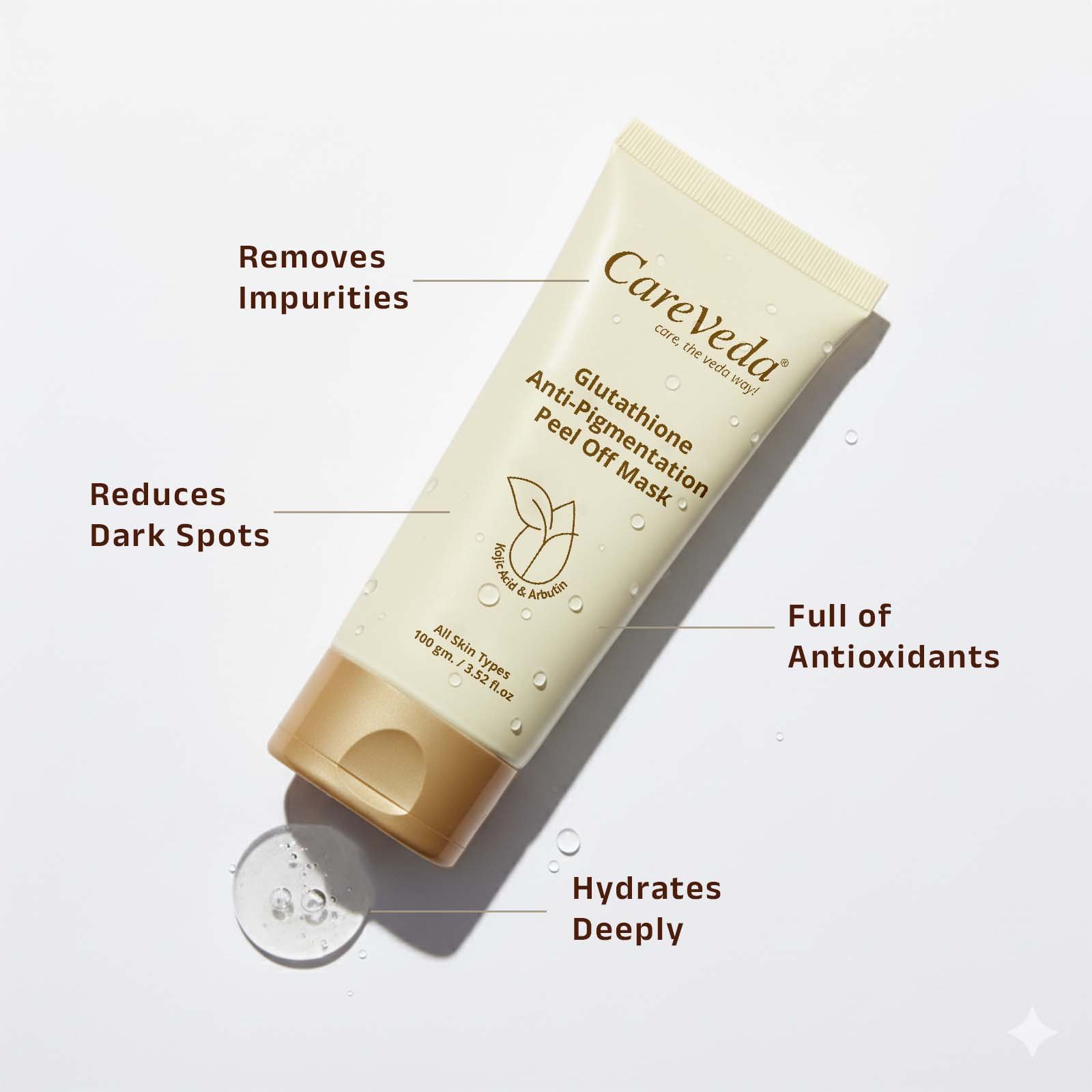 CareVeda Glutathione Brightening Peel-Off Mask is designed to detoxify, brighten, and rejuvenate your skin. Powered with Glutathione, Kojic Acid, and Arbutin E, it effectively removes dirt, excess oil, blackheads, dead skin cells, while helping to reduce pigmentation and dark spots. The result is smoother, clearer, and radiant skin with a healthy glow.