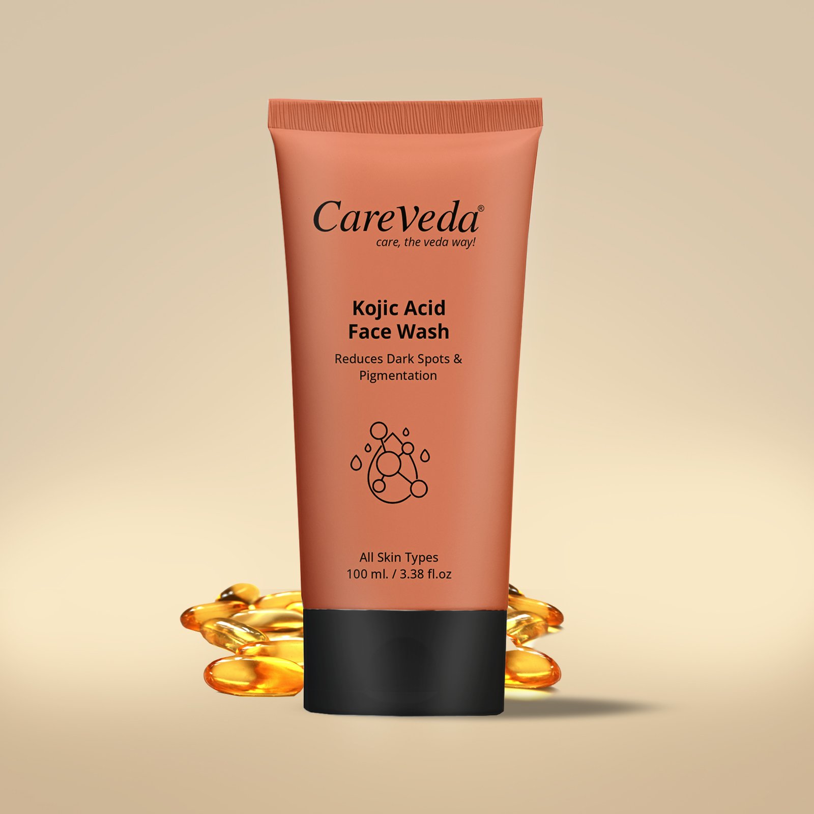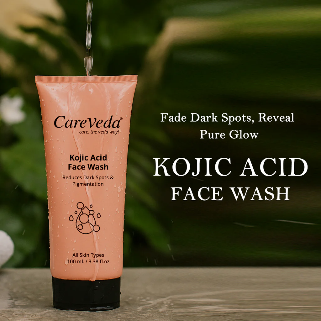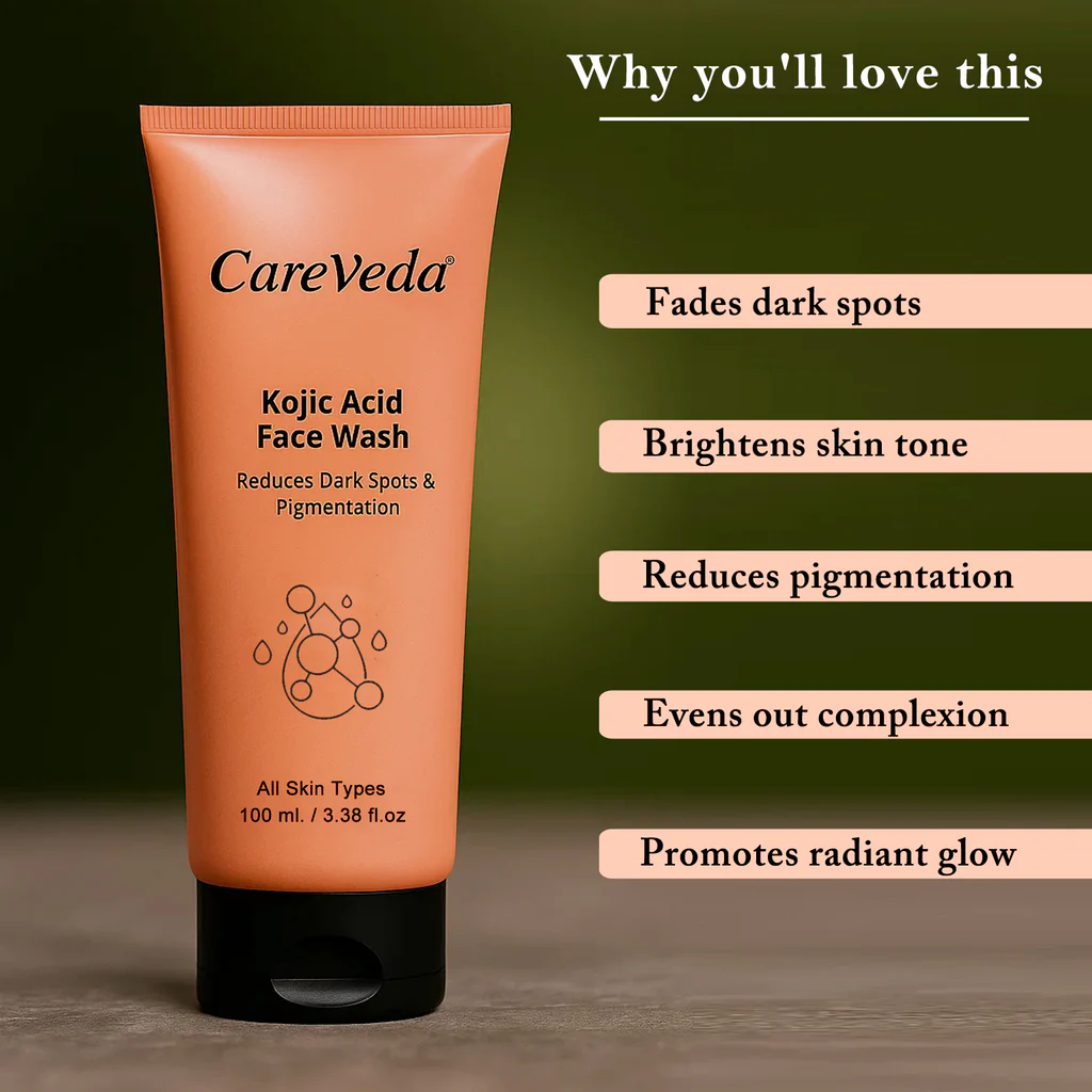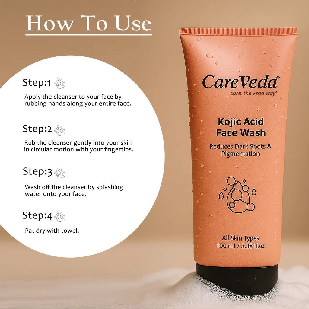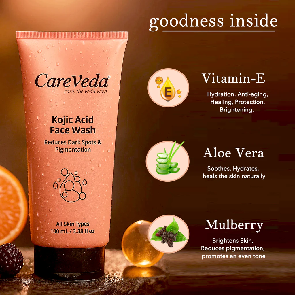 CareVeda Kojic Acid Face Wash is a gentle yet powerful formulation designed to reduce dark spots, pigmentation, and uneven skin tone. Enriched with the skin-brightening power of Kojic Acid, this face wash targets the root causes of discoloration while cleansing your skin deeply and effectively. Suitable for all skin types, it provides a radiant glow with every wash and promotes a visibly even complexion over time. This daily-use face wash helps fade acne marks, tanning, and blemishes, making it ideal for those dealing with pigmentation-related concerns. With a mild foaming texture, it lifts away dirt, oil, and impurities while maintaining the skin’s moisture balance. Kojic Acid, derived from natural sources, is known for its ability to inhibit melanin production, which helps reduce dark spots and brighten the overall skin tone.